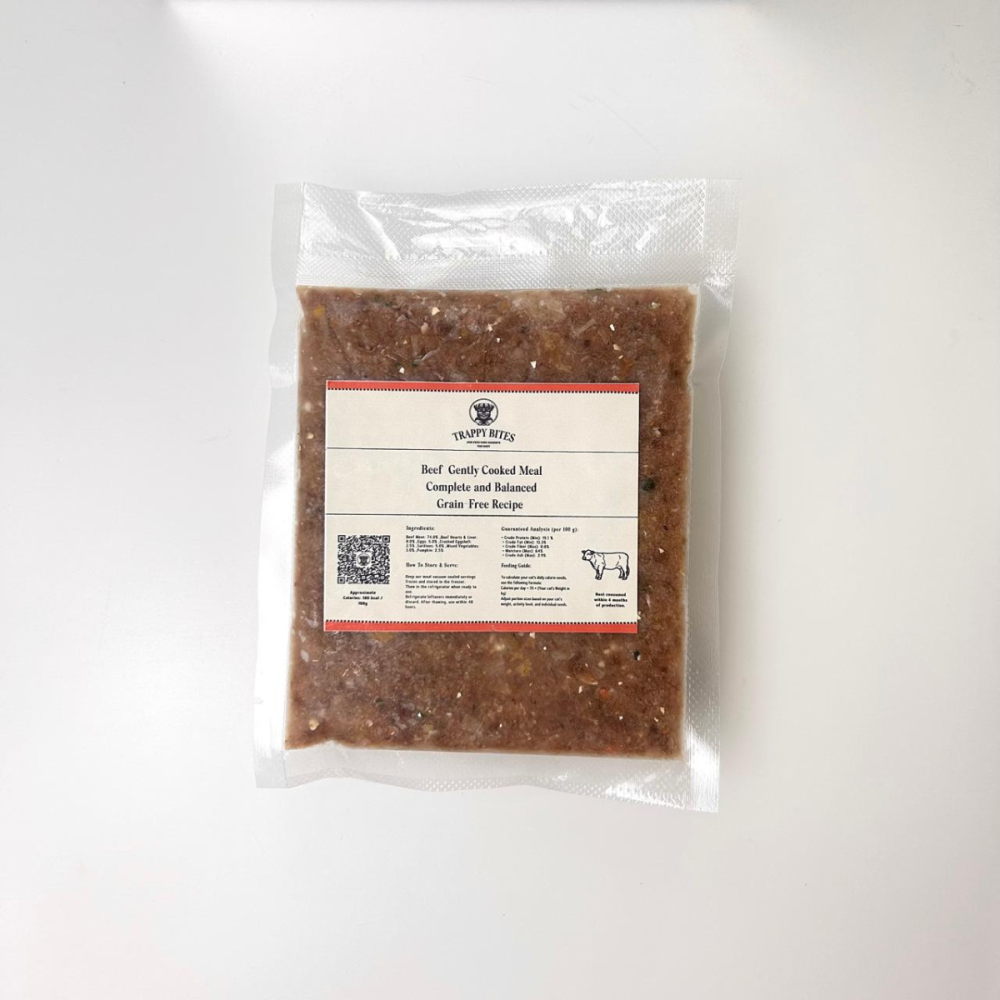 The Beef Package from Trappy Bites offers complete and balanced meals, each weighing 150g, carefully formulated according to AAFCO/FEDIAF standards, and suitable for cats of all ages and breeds.